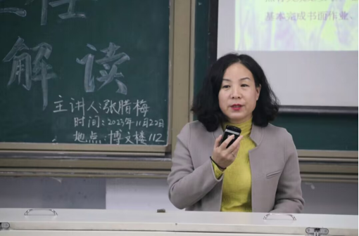 讲座现场张腊梅老师从小学作业、睡眠、手机、读物、体质等“五项管理”进行深入解读,贯彻落实社会主义核心价值观及党的教育方针,严格按照教育局下发的文件精神,认真解读每个管理的内容及要求。最后,张老师希望在场各位未来的老师教书有成绩、育人有效果、家长有信任,做有温度的教育,做有温度的老师。